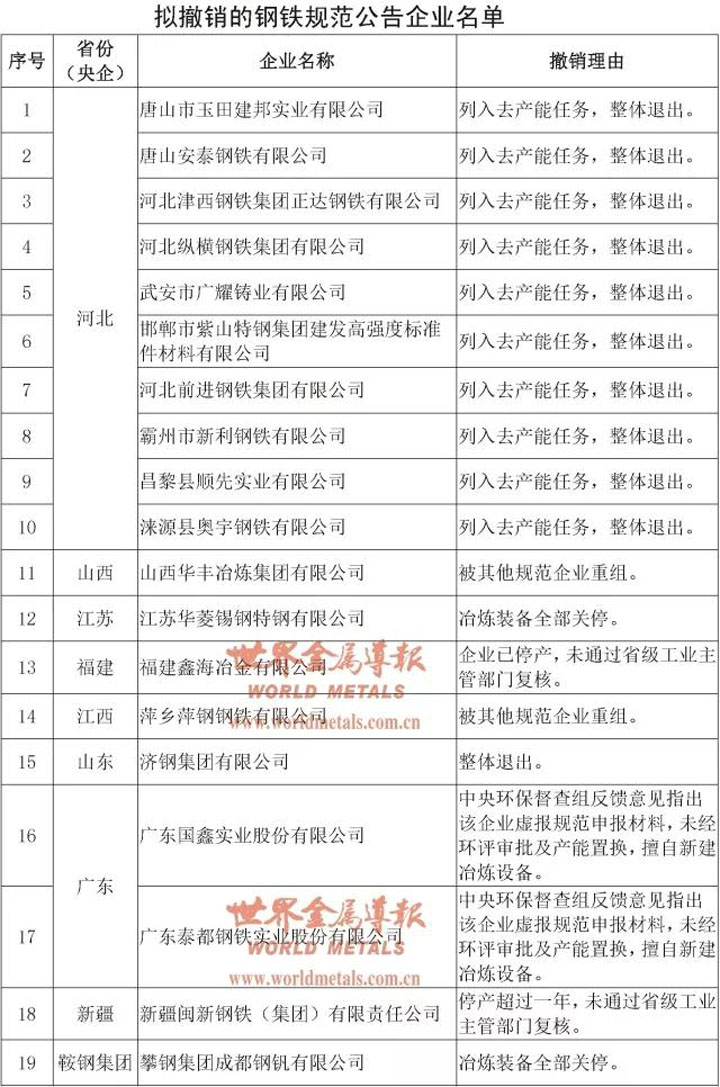 19家企业存在列入去产能任务整体退出、被其他规范企业重组、停产、冶炼装备全部关停等情形,拟撤销钢铁规范公告;
